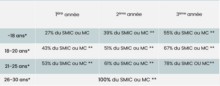*Les majorations de salaire liées au passage d’une tranche d’âge à une autre prennent effet à compter du 1er jour suivant le jour où l’apprenti atteint 18 ans, 21 ans ou 26 ans